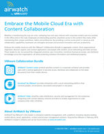 AirWatch Mobile Content Management (MCM) allows you to secure document distribution and mobile access to corporate documents through a native mobile app. AirWatch Content Locker enables your employees to securely access corporate resources on-the-go.